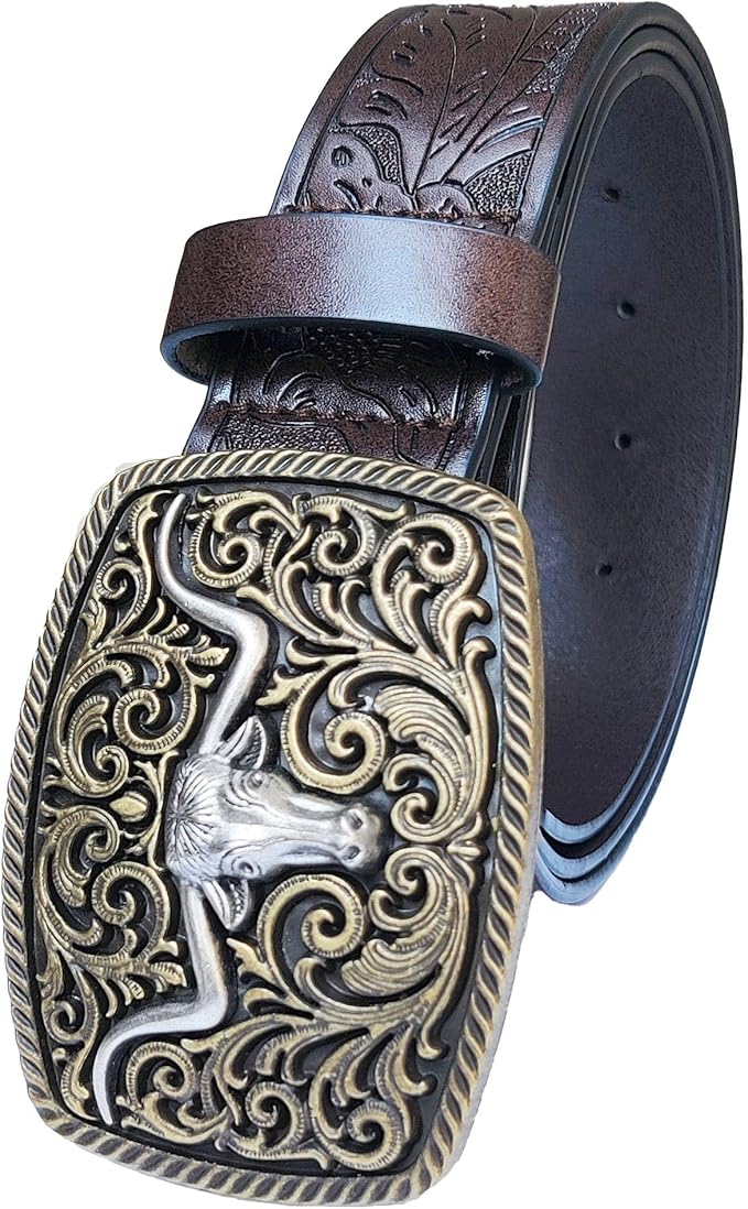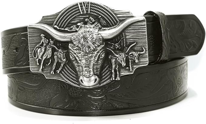 Western Cowboy Horse & Bull Style Buckle And Genuine Cow Leather Belts