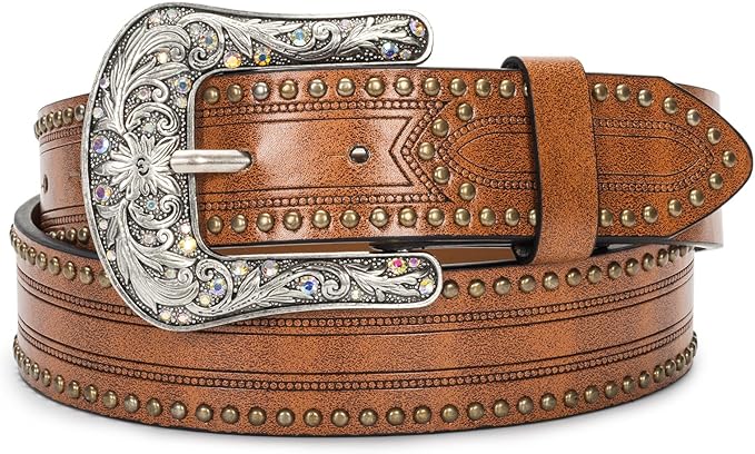 Western Cowboy Belts Cowgirl Waist-Belts PU Leather Vintage Floral with Bling Rivets Stylish Buckle