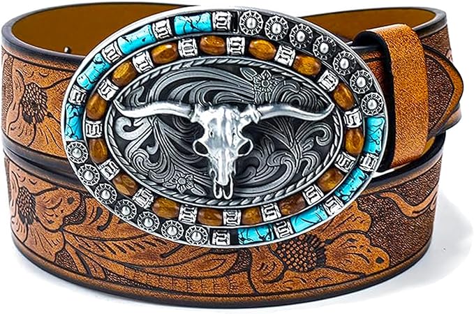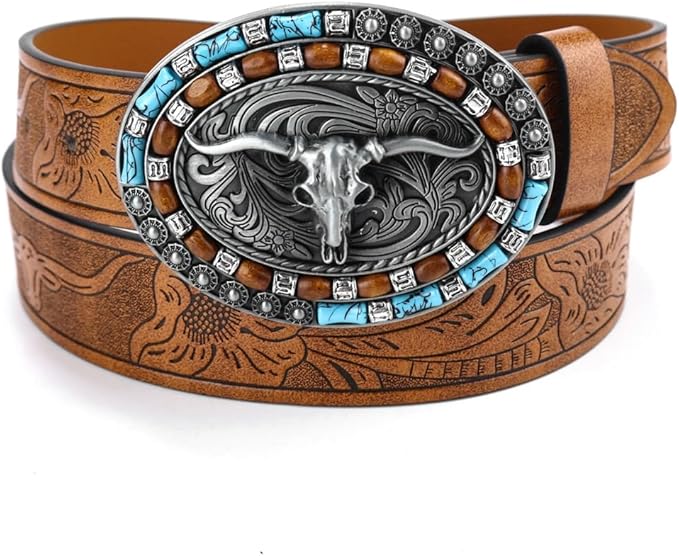 Women-Men Western Cowboy Belt - PU Leather Longhorn Bull Turquoise Embossed Buckle Belt for Jeans Pants Dresses