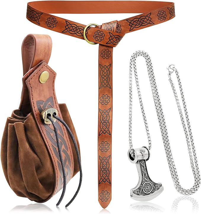 3 Pieces Medieval Viking Leather Belt, Retro Drawstring Belt Bag Pouch and Stainless Steel Chain Axe Necklace, Renaissance